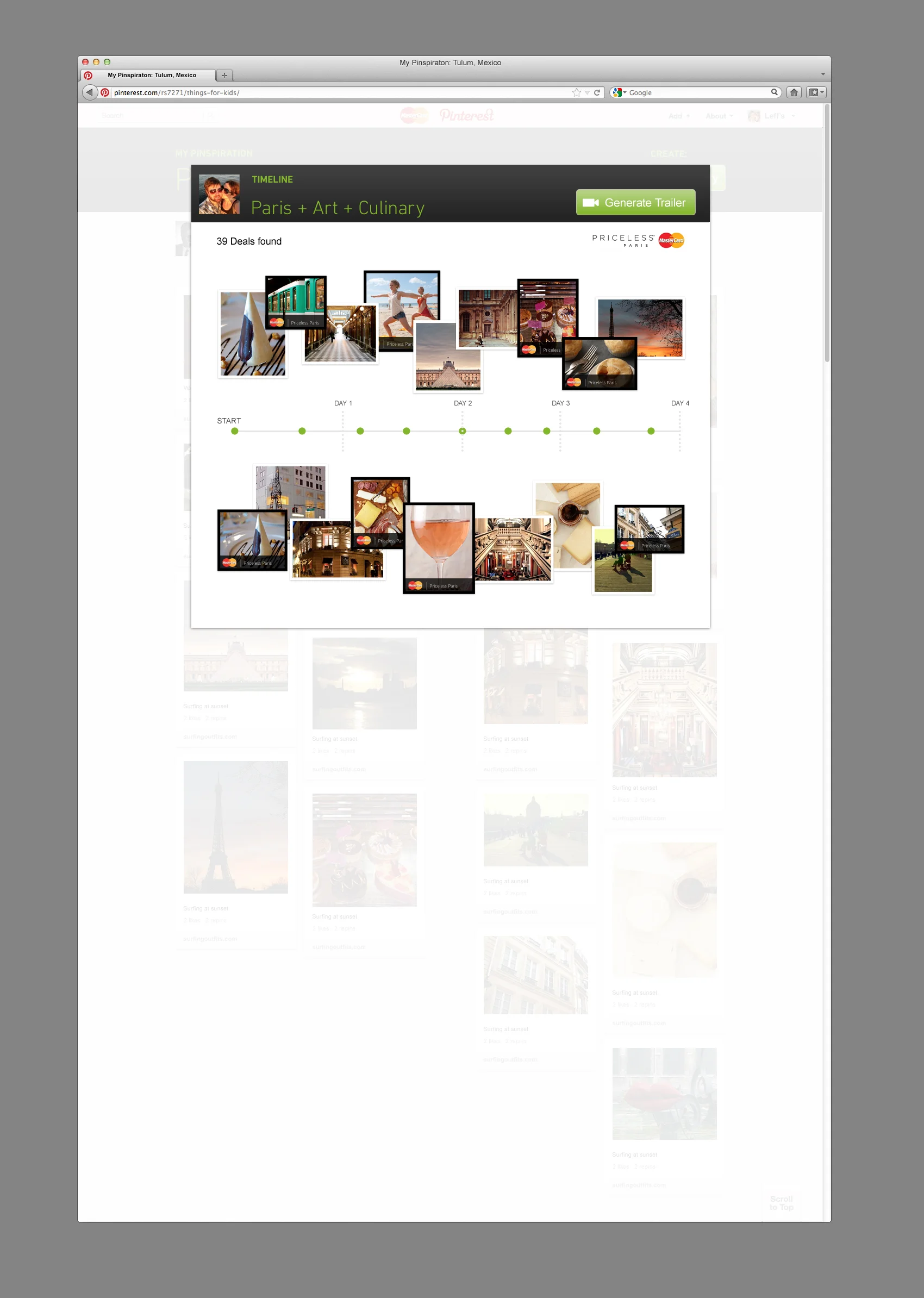 Priceless is MasterCard's way of describing that little something special that money can't buy. It's not about transactions. It's about experiences. We wanted to make the MasterCard Priceless promise more personal by tailoring its offers to its customers' preferences. So with that we created the MasterCard Priceless Pinspiration app that allowed users to visualize their dream vacation on Pinterest board, in order to instantly generate a custom travel itinerary courtesy of MasterCard. Priceless.