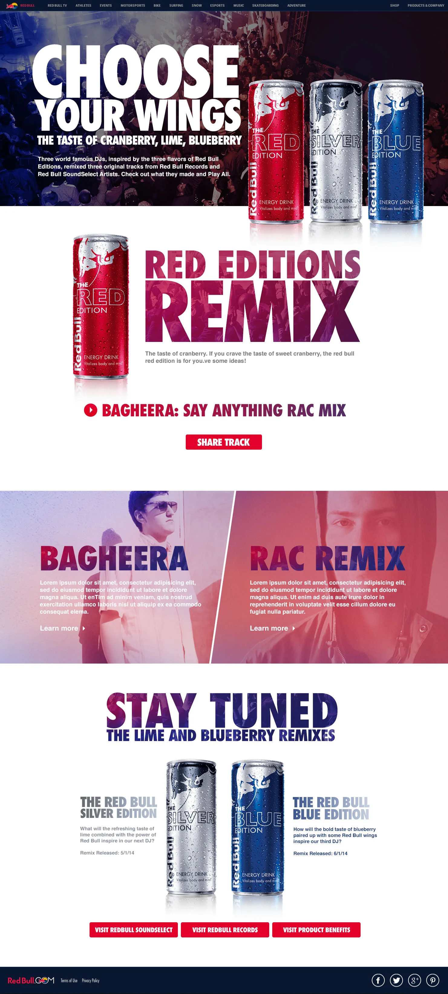 A bold, fun and young looking site was designed to promote the RedBull Editions’ drinks and the music events sponsored by the RedBull brand. In addition to the site, social media components and OOH posters were designed for the LA, DC and NY markets.